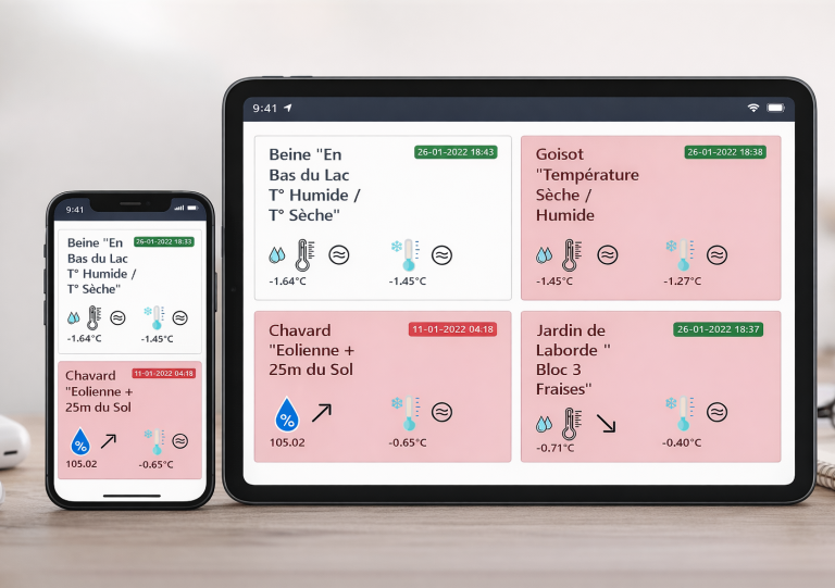 Notre solution repose sur des capteurs intelligents de température et d’humidité connectés à une plateforme digitale. Chaque sonde transmet des données en temps réel via un réseau sans fil, et dès que des seuils critiques sont franchis, les utilisateurs reçoivent une alerte immédiate par SMS ou notification mobile. Cela permet au viticulteur d’intervenir rapidement pour déclencher les mesures anti-gel appropriées.